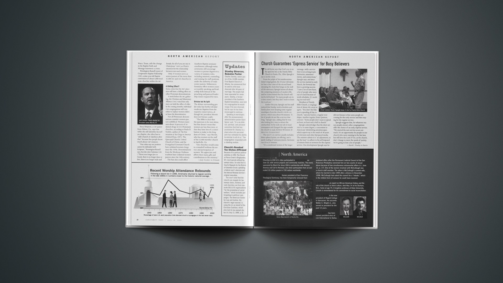 North AmericaChurches in 450 U.S. cities participated in Jesus Day 2000 on June 10, with service projects and community marches. The event, sponsored by March for Jesus USA in partnership with Mission America and Call to Renewal, also drew participation from an estimated 10 million people in 150 nations worldwide.Donald L. McCullough, former president of San Francisco Theological Seminary, has been temporarily removed from ordained office after the Permanent Judicial Council of the San Francisco Presbytery convicted him on two counts of sexual abuse because of two simultaneous extramarital affairs (CT, June 12, p. 17). One of the women involved with McCullough was a church staff member. The other is McCullough’s current wife, whom he married in late 1999 after a divorce in December 1998. McCullough had asked the council for a “rebuke,” which is the mildest form of censure he could have received. C. Eric Lincoln, an expert on African-American history and the role of the church in black culture, died May 14 at his Durham, N.C., home at age 75. A longtime professor at Duke University, Lincoln is remembered for his commitment to racial reconciliation.Rod J. K. Wilson is the new president of Regent College in Vancouver. He succeeds Walter C. Wright Jr., who served as president for the past 12 years.Daniel Wicher has been named president-elect of cam International in Dallas.