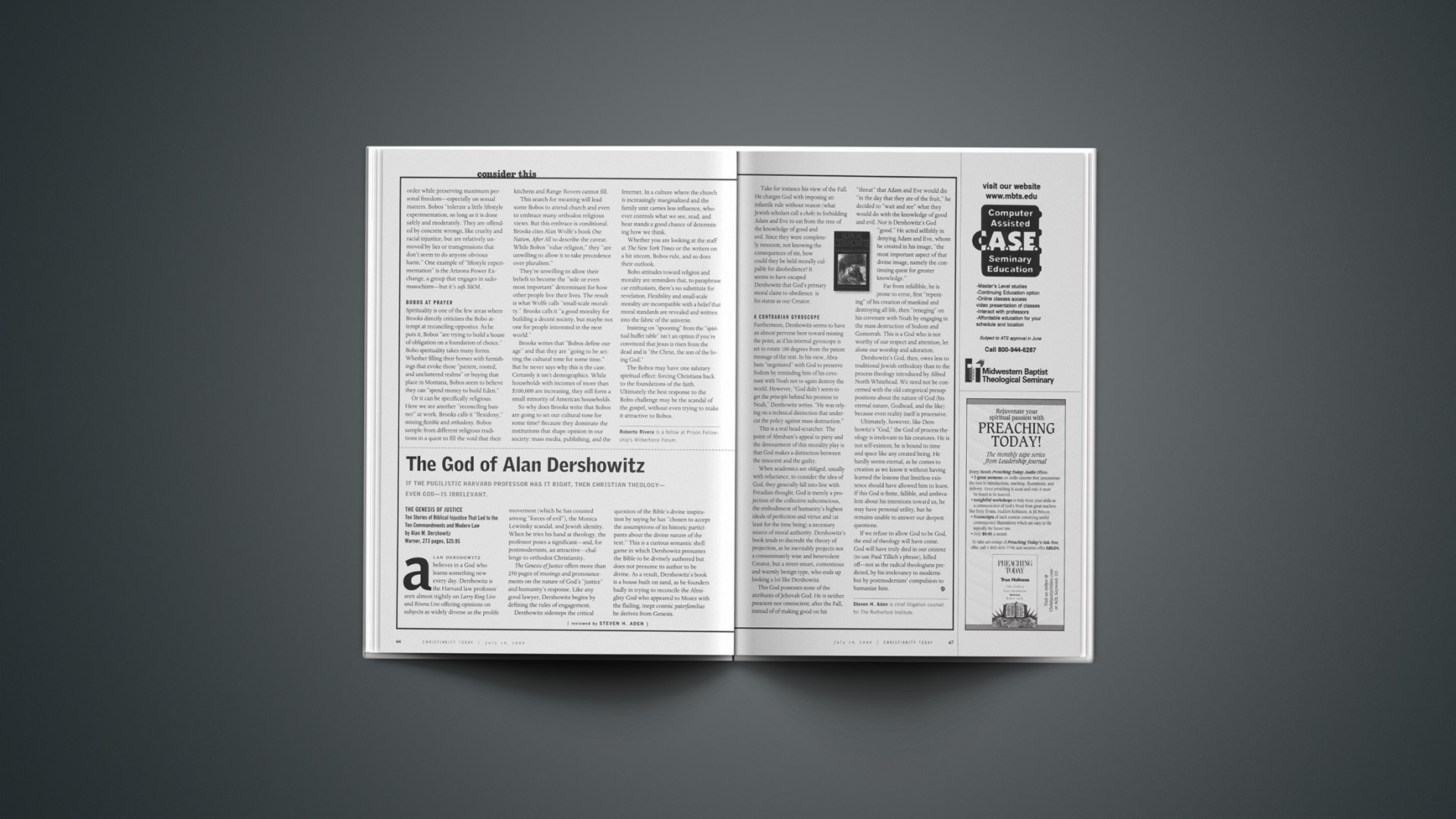 Alan Dershowitz believes in a God who learns something new every day. Dershowitz is the Harvard law professor seen almost nightly on Larry King Live and Rivera Live offering opinions on subjects as widely diverse as the prolife movement (which he has counted among “forces of evil”), the Monica Lewinsky scandal, and Jewish identity. When he tries his hand at theology, the professor poses a significant–and, for postmodernists, an attractive–challenge to orthodox Christianity.The Genesis of Justice offers more than 250 pages of musings and pronouncements on the nature of God’s “justice” and humanity’s response. Like any good lawyer, Dershowitz begins by defining the rules of engagement.Dershowitz sidesteps the critical question of the Bible’s divine inspiration by saying he has “chosen to accept the assumptions of its historic participants about the divine nature of the text.” This is a curious semantic shell game in which Dershowitz presumes the Bible to be divinely authored but does not presume its author to be divine. As a result, Dershowitz’s book is a house built on sand, as he founders badly in trying to reconcile the Almighty God who appeared to Moses with the flailing, inept cosmic paterfamilias he derives from Genesis.Take for instance his view of the Fall. He charges God with imposing an infantile rule without reason (what Jewish scholars call a chok) in forbidding Adam and Eve to eat from the tree of the knowledge of good and evil. Since they were completely innocent, not knowing the consequences of sin, how could they be held morally culpable for disobedience? It seems to have escaped Dershowitz that God’s primary moral claim to obedience is his status as our Creator.