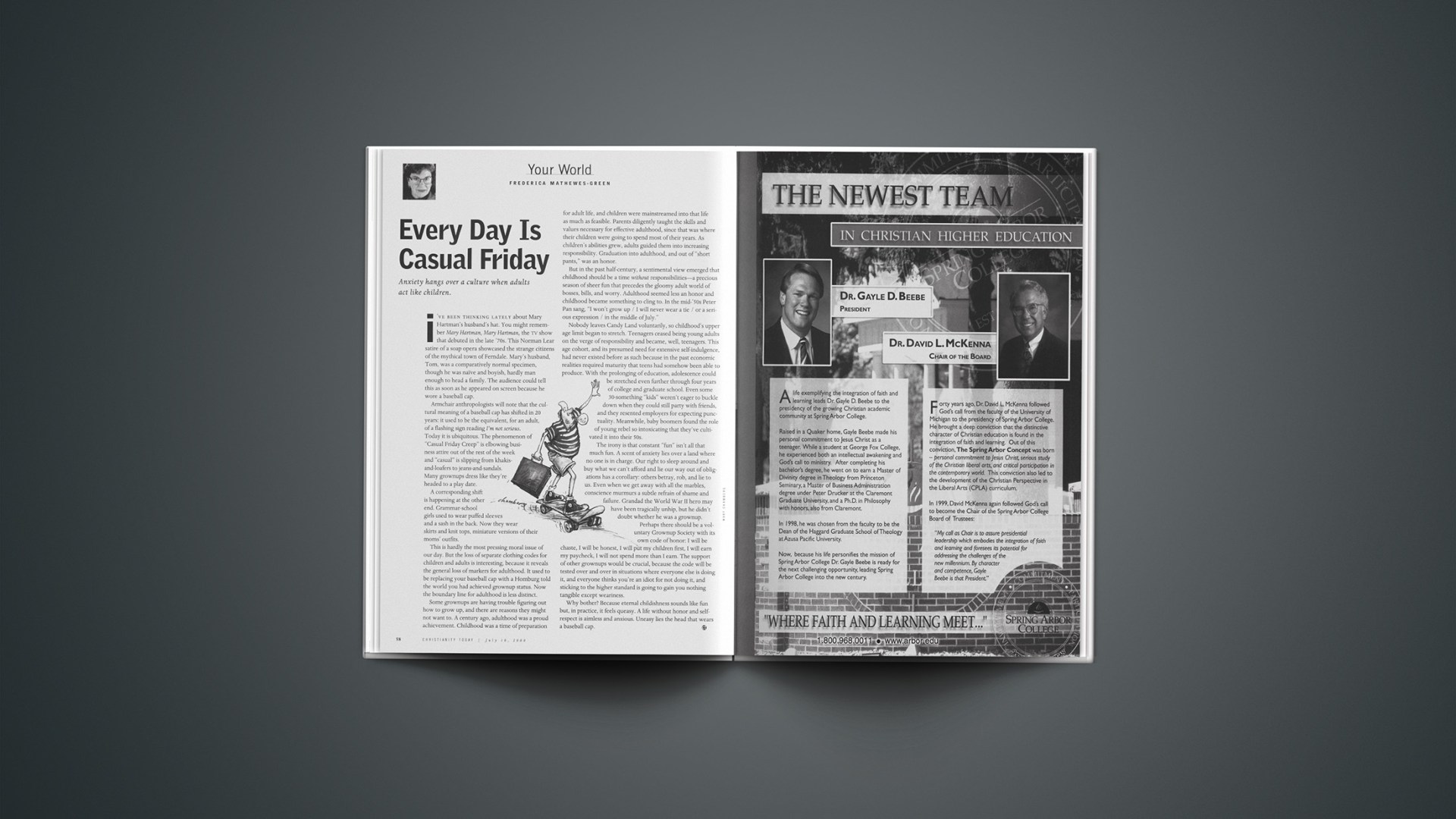 Christianity Today‘s sister publication Christian Parenting Today ran an article entitled “Growing up with God to encourage parents on how to train children for adulthood and maturity in Christ.Is the Casual Friday phenomenon going too far? Read U.S. News‘s “Casual Friday, five days a week” and ABCNews’s “Casual Chaos: Casual dress causes confusion at work.”Adolescence can extend past 30 says a New Harbinger article.Christianweek says TV is partly to blame, because sitcom stars refuse to grow up.Many of William J. O’Malley’s Peter Pan Syndrome conclusions agree with Mathewes-Green’s claim that teenagers and their “presumed need for extensive self-indulgence,” never existed until economic realities no longer demanded maturity from adolescents.Read a sermon about “Peter Pan Christians” who are afraid to move from spiritual milk to meat.If you’re a fan of the “Mary Hartman, Mary Hartman” show, or you’re curious to know what it was all about check out the sites for the “Mary Hartman, Mary Hartman” show, or the Fernwood Central site, or the Mary Kay Place Place.Visit Frederica Mathewes-Green’s Web site at www.frederica.comEarlier “Your World” columns by Frederica Mathewes-Green columns include: