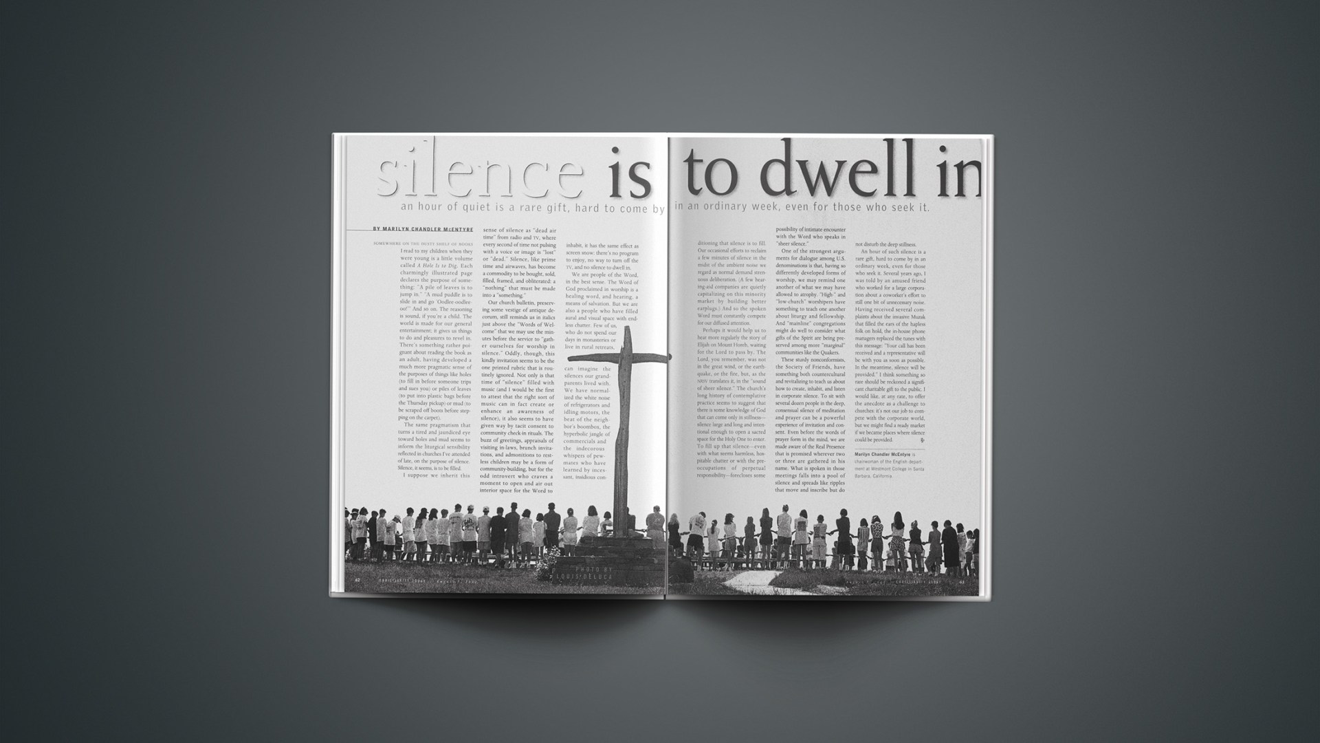 Somewhere on the dusty shelf of books I read to my children when they were young is a little volume called A Hole Is to Dig. Each charmingly illustrated page declares the purpose of something: “A pile of leaves is to jump in.” “A mud puddle is to slide in and go ‘Oodlee-oodlee-oo!'” And so on. The reasoning is sound, if you’re a child. The world is made for our general entertainment; it gives us things to do and pleasures to revel in. There’s something rather poignant about reading the book as an adult, having developed a much more pragmatic sense of the purposes of things like holes (to fill in before someone trips and sues you) or piles of leaves (to put into plastic bags before the Thursday pickup) or mud (to be scraped off boots before stepping on the carpet). The same pragmatism that turns a tired and jaundiced eye toward holes and mud seems to inform the liturgical sensibility reflected in churches I’ve attended of late, on the purpose of silence. Silence, it seems, is to be filled. I suppose we inherit this sense of silence as “dead air time” from radio and TV, where every second of time not pulsing with a voice or image is “lost” or “dead.” Silence, like prime time and airwaves, has become a commodity to be bought, sold, filled, framed, and obliterated: a “nothing” that must be made into a “something.” Our church bulletin, preserving some vestige of antique decorum, still reminds us in italics just above the “Words of Welcome” that we may use the minutes before the service to “gather ourselves for worship in silence.” Oddly, though, this kindly invitation seems to be the one printed rubric that is routinely ignored. Not only is that time of “silence” filled with music (and I would be the first to attest that the right sort of music can in fact create or enhance an awareness of silence), it also seems to have given way by tacit consent to community check-in rituals. The buzz of greetings, appraisals of visiting in-laws, brunch invitations, and admonitions to restless children may be a form of community-building, but for the odd introvert who craves a moment to open and air out interior space for the Word to inhabit, it has the same effect as screen snow: there’s no program to enjoy, no way to turn off the TV, and no silence to dwell in.We are people of the Word, in the best sense. The Word of God proclaimed in worship is a healing word, and hearing, a means of salvation. But we are also a people who have filled aural and visual space with endless chatter. Few of us, who do not spend our days in monasteries or live in rural retreats, can imagine the silences our grandparents lived with. We have normalized the white noise of refrigerators and idling motors, the beat of the neighbor’s boom box, the hyperbolic jangle of commercials and the indecorous whispers of pewmates who have learned by incessant, insidious conditioning that silence is to fill. Our occasional efforts to reclaim a few minutes of silence in the midst of the ambient noise we regard as normal demand strenuous deliberation. (A few hearing-aid companies are quietly capitalizing on this minority market by building better earplugs.) And so the spoken Word must constantly compete for our diffused attention.Perhaps it would help us to hear more regularly the story of Elijah on Mount Horeb, waiting for the Lord to pass by. The Lord, you remember, was not in the great wind, or the earthquake, or the fire, but, as the NRSV translates it, in the “sound of sheer silence.” The church’s long history of contemplative practice seems to suggest that there is some knowledge of God that can come only in stillness—silence large and long and intentional enough to open a sacred space for the Holy One to enter. To fill up that silence—even with what seems harmless, hospitable chatter or with the preoccupations of perpetual responsibility—forecloses some possibility of intimate encounter with the Word who speaks in “sheer silence.”One of the strongest arguments for dialogue among U.S. denominations is that, having so differently developed forms of worship, we may remind one another of what we may have allowed to atrophy. “High-” and “low-church” worshipers have something to teach one another about liturgy and fellowship. And “mainline” congregations might do well to consider what gifts of the Spirit are being preserved among more “marginal” communities like the Quakers.These sturdy nonconformists, the Society of Friends, have something both countercultural and revitalizing to teach us about how to create, inhabit, and listen in corporate silence. To sit with several dozen people in the deep, consensual silence of meditation and prayer can be a powerful experience of invitation and consent. Even before the words of prayer form in the mind, we are made aware of the Real Presence that is promised wherever two or three are gathered in his name. What is spoken in those meetings falls into a pool of silence and spreads like ripples that move and inscribe but do not disturb the deep stillness.An hour of such silence is a rare gift, hard to come by in an ordinary week, even for those who seek it. Several years ago, I was told by an amused friend who worked for a large corporation about a coworker’s effort to still one bit of unnecessary noise. Having received several complaints about the invasive Muzak that filled the ears of the hapless folk on hold, the in-house phone managers replaced the tunes with this message: “Your call has been received and a representative will be with you as soon as possible. In the meantime, silence will be provided.” I think something so rare should be reckoned a significant charitable gift to the public. I would like, at any rate, to offer the anecdote as a challenge to churches: it’s not our job to compete with the corporate world, but we might find a ready market if we became places where silence could be provided.