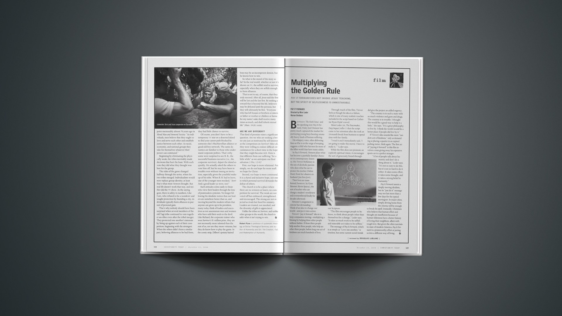 Between The Sixth Sense and the spanking-new Pay It Forward, Haley Joel Osment has pretty much captured the market for portraying young boys bearing unusually heavy loads of human suffering.His whispery voice, often delivering lines as if he is on the verge of weeping, suggests a child who has seen far more of the fallen world than have many adults.In Pay It Forward, Osment plays what has become a painfully familiar character in contemporary America. His Trevor McKinney is the son of alcoholic parents who does what he can to protect his mother (Helen Hunt) from her abusive ex-husband (Jon Bon Jovi). Their lives are transformed, however, by Gene Simonet (Kevin Spacey), the sort of teacher who can change a student’s worldview and is remembered fondly for decades afterward.Simonet’s assignment is concise but demanding: Think of an idea to change our world—and put it into action.Trevor’s “pay it forward” idea is to keep compassion moving—multiplying a blessing by helping three other people without fanfare. If those three people help another three people, who help another three people, before long one act of kindness can touch hundreds of lives.Through much of the film, Trevor feels as though his idea is a failure, which is one of many realistic touches included in the script based on Catherine Ryan Hyde’s novel. Mimi Leder (ER, The Peacemaker, Deep Impact) tells CT that the script came to her attention after she took an 18-month break from business to spend time with her family.”I read it and I immediately said, ‘I am going to make this movie. I have to make it,’ ” Leder says.While the film does not promote an explicitly spiritual vision, it encourages the sort of generosity found throughout Scripture.”The film encourages people to be brave, to think about people other than themselves for a change,” Leder says. “It takes as much work to be selfish and miserable as it takes to be selfless.”The message of Pay It Forward, which is as simple as “Love one another,” is timeless, but some current social trends did give the project an added urgency.”The country is in such a state with so much violence and guns and drugs. The country is in trouble. I thought this would be a good way to help it a little,” she says. “It’s a great philosophy to live by. I think the world would be a better place if people did live by it.”If Trevor’s idea sounds like mere “random acts of kindness,” only as demanding as placing a quarter in an expired parking meter, think again: The first act of “paying it forward” in this film involves a man giving away his expensive sports car to a perfect stranger.”A lot of people talk about humanity and don’t do a thing about it,” Leder says. “It’s not so easy to do this, but it’s not so hard to do it either. It takes some effort, it takes some thought, and it takes a strong belief in humanity.”Pay It Forward asserts a deeply moving idealism, but its “just do it” message may not last more than a few days for the typical moviegoer. In major cities, simply driving home from the cinema will be enough to break the spell. Ironically, Christians who believe that human effort and thought are insufficient because of human fallenness have a better history of loving their neighbors, albeit with tough love. But given the often narcissistic state of modern America, Pay It Forward is a praiseworthy effort at jarring us into a different way of living.