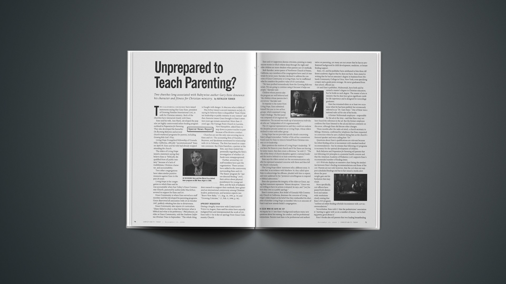 Ezzo has also tried to intimidate those who write about him. In one striking case, after the newsweekly World ran a story by senior writer Roy Maynard that detailed criticism of GFI, Ezzo concocted a disparaging interview transcript from two previous phone conversations with Maynard. Ezzo sent letters to World editor Marvin Olasky calling for an investigation and suggesting the magazine consider asking for Maynard’s resignation. He asked Maynard’s church elders to take disciplinary action against him. Ezzo wrote two markedly different versions of the interviews. Frank York, his editorial director at the time, says there were no audiotapes.