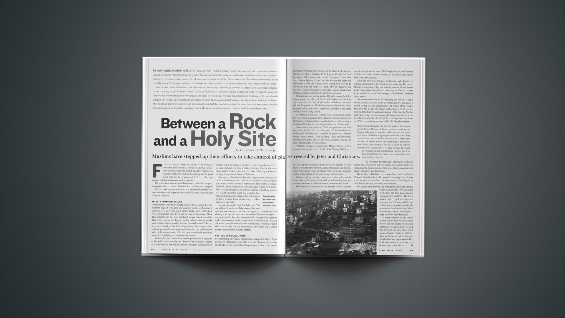 In order for Jews, Christians, and Muslims to reconcile, they would do well to listen to one another’s stories. In the January issue of Christianity Today, a Palestinian Christian lawyer explained what he thought were the reasons for the breakdown of the peace process. In this issue, we hear from Clarence H. Wagner Jr., who heads Bridges for Peace, an evangelical Christian ministry that aims to build support for the people and land of Israel. The peace process as such is not his subject. Instead, he describes what he sees from his apartment window near Jerusalem, especially regarding recent Muslim encroachments on Jewish and Christian holy sites.