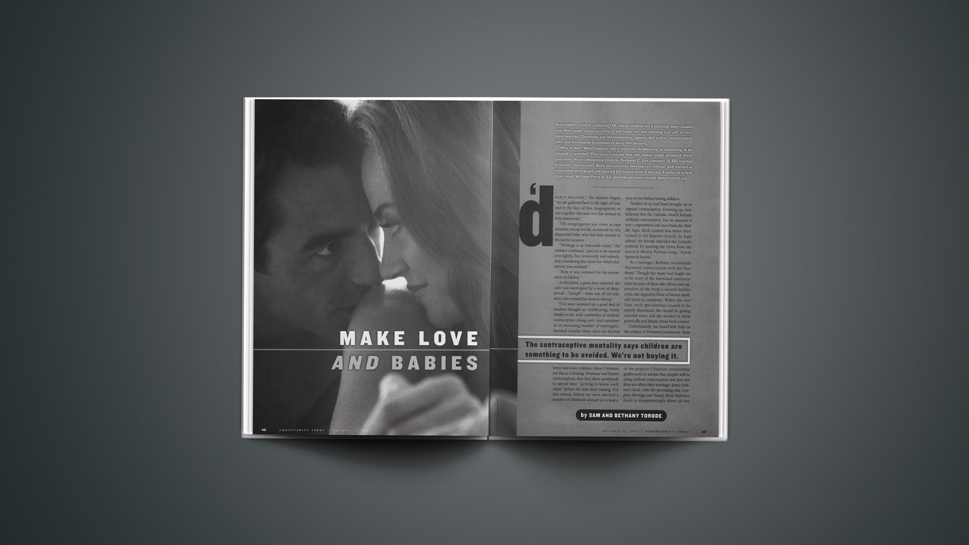 Sam and Bethany Torode work at home in rural Wisconsin. Their son, Gideon, was born in September. This article has been developed and expanded into a book, Open Embrace: A Protestant Couple Rethinks Contraception (Eerdmans, Spring 2002). Their Web site is www.torodedesign.com.