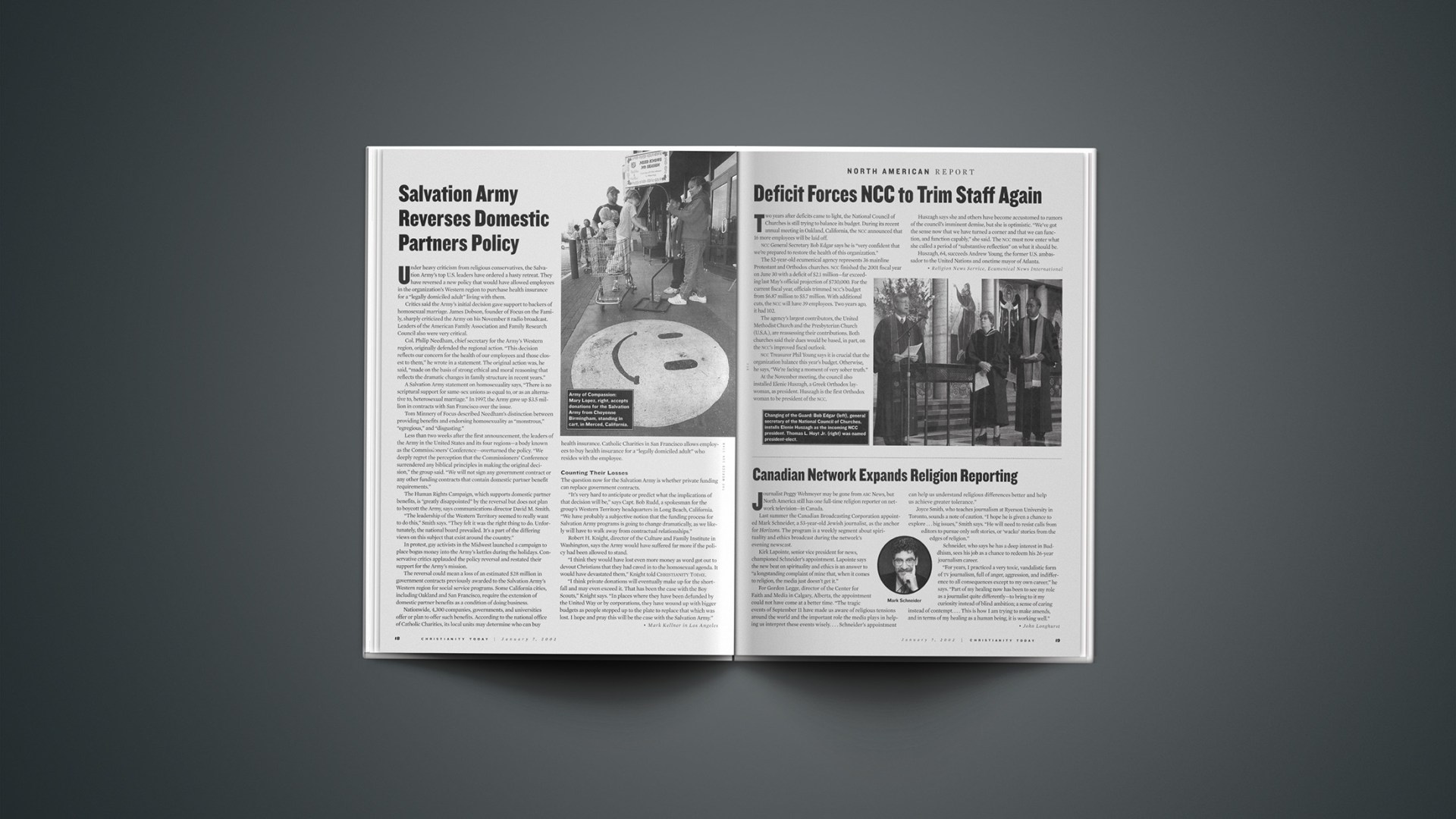 The 52-year-old ecumenical agency represents 36 mainline Protestant and Orthodox churches. NCC finished the 2001 fiscal year on June 30 with a deficit of $2.1 million—far exceeding last May’s official projection of $730,000. For the current fiscal year, officials trimmed NCC’s budget from $6.87 million to $5.7 million. With additional cuts, the NCC will have 39 employees. Two years ago, it had 102.