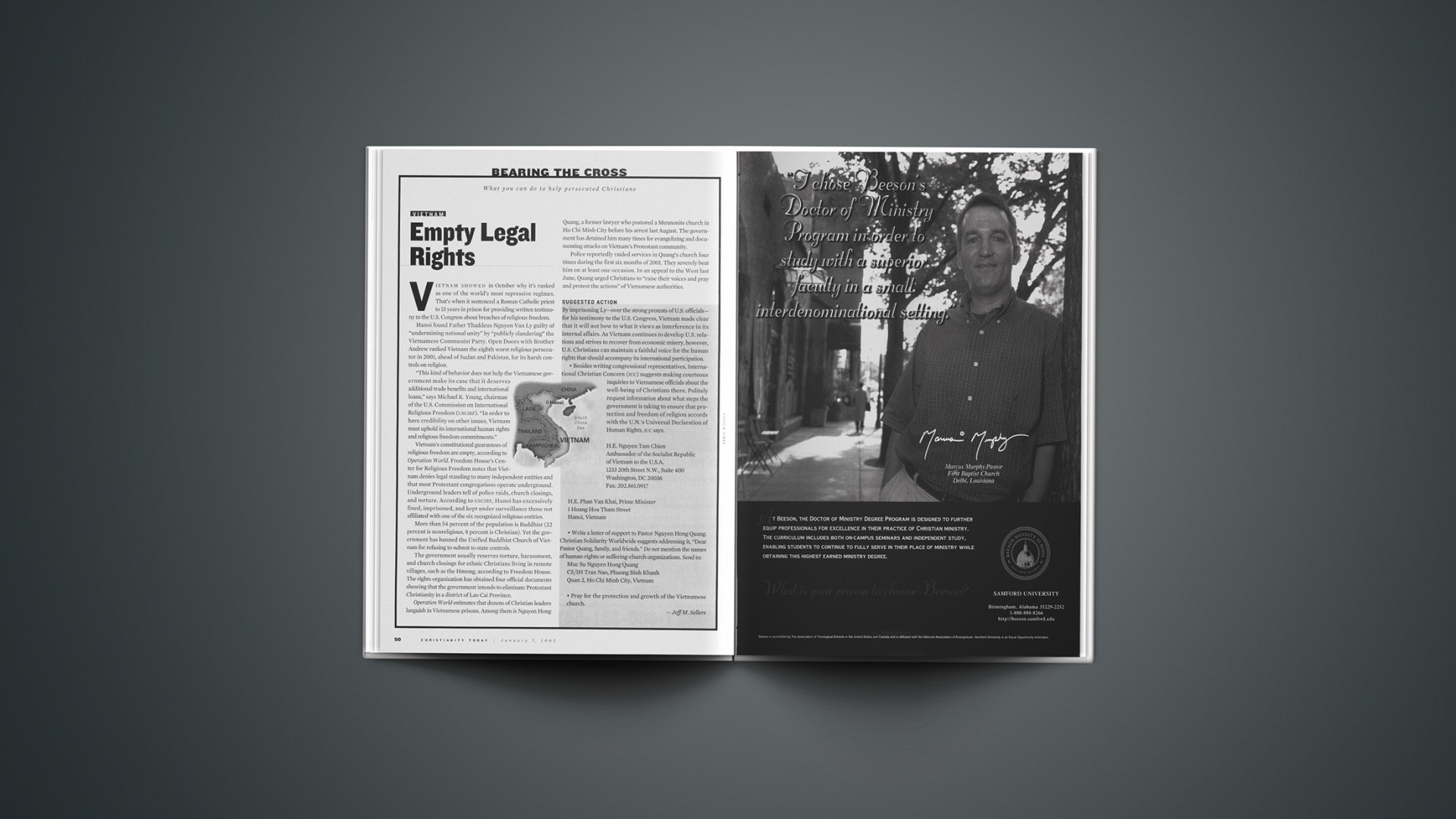 Police reportedly raided services in Quang’s church four times during the first six months of 2001. They severely beat him on at least one occasion. In an appeal to the West last June, Quang urged Christians to “raise their voices and pray and protest the actions” of Vietnamese authorities.