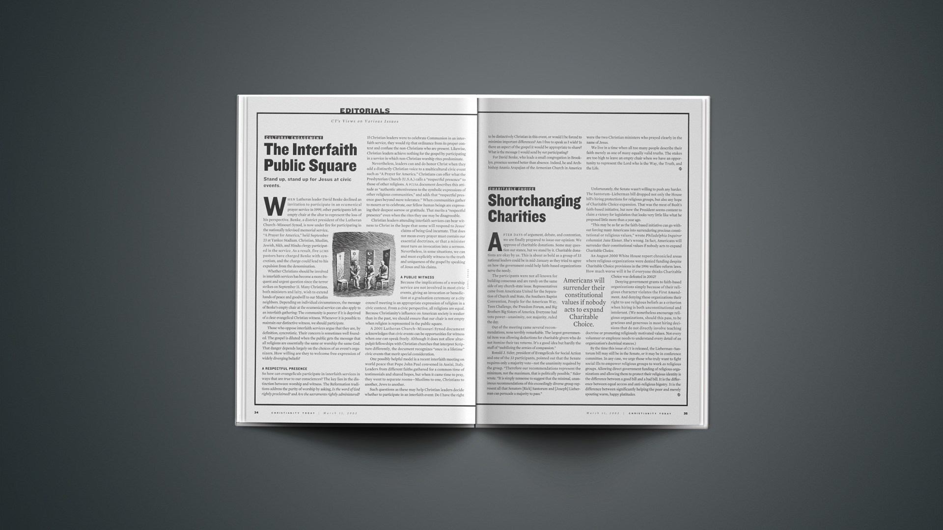 Whether Christians should be involved in interfaith services has become a more frequent and urgent question since the terror strikes on September 11. Many Christians, both ministers and laity, wish to extend hands of peace and goodwill to our Muslim neighbors. Depending on individual circumstances, the message of Benke’s empty chair at the ecumenical service can also apply to an interfaith gathering: The community is poorer if it is deprived of a clear evangelical Christian witness. Whenever it is possible to maintain our distinctive witness, we should participate.