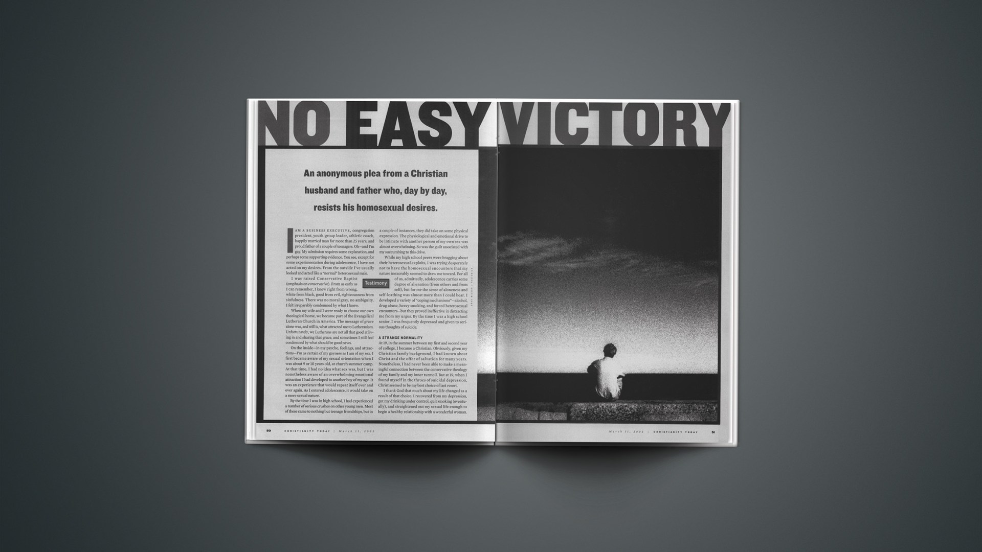I am a business executive, congregation president, youth-group leader, athletic coach, happily married man for more than 25 years, and proud father of a couple of teenagers. Oh—and I’m gay. My admission requires some explanation, and perhaps some supporting evidence. You see, except for some experimentation during adolescence, I have not acted on my desires. From the outside I’ve usually looked and acted like a “normal” heterosexual male.