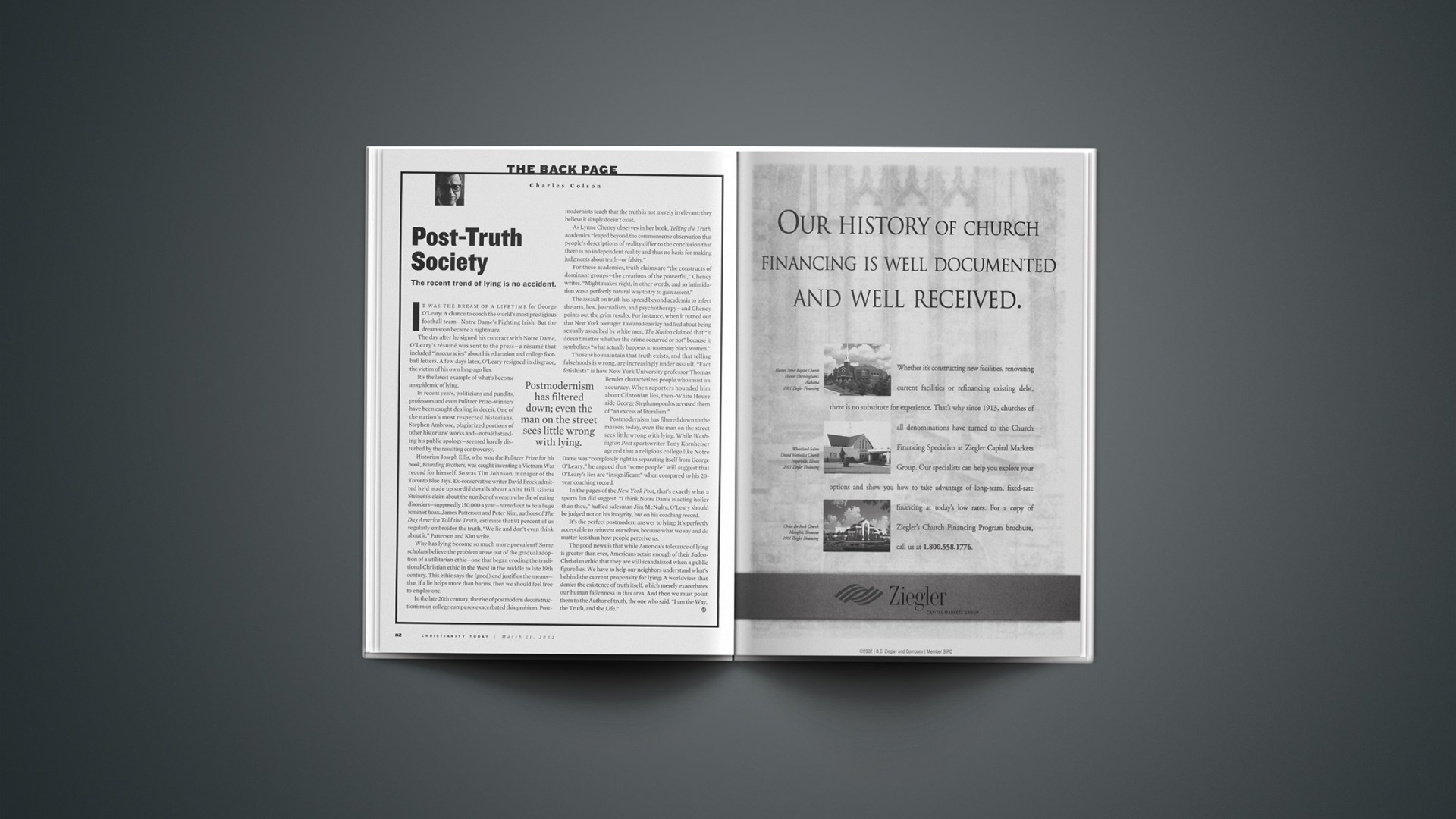 Postmodernism has filtered down to the masses; today, even the man on the street sees little wrong with lying. While Washington Post sportswriter Tony Kornheiser agreed that a religious college like Notre Dame was “completely right in separating itself from George O’Leary,” he argued that “some people” will suggest that O’Leary’s lies are “insignificant” when compared to his 20-year coaching record.