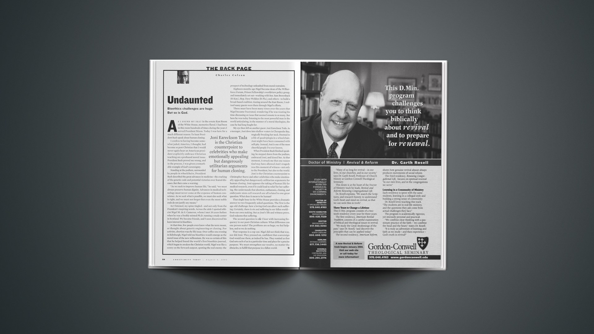 When President Bush finished speaking, he stepped down from the podium, embraced Joni, and kissed her. At that moment, it struck me that one reason God may have allowed Joni’s tragedy was this moment of witness—not only to the President, but also to the world. Joni is the Christian counterpoint to Christopher Reeve and other celebrities who make emotionally appealing but dangerously utilitarian arguments for human cloning. Joni opposes the taking of human life for medical research, even if it could lead to relief for her suffering. She understands that abortion, euthanasia, cloning, and embryonic stem-cell research are all related to one great question: What does it mean to be human?