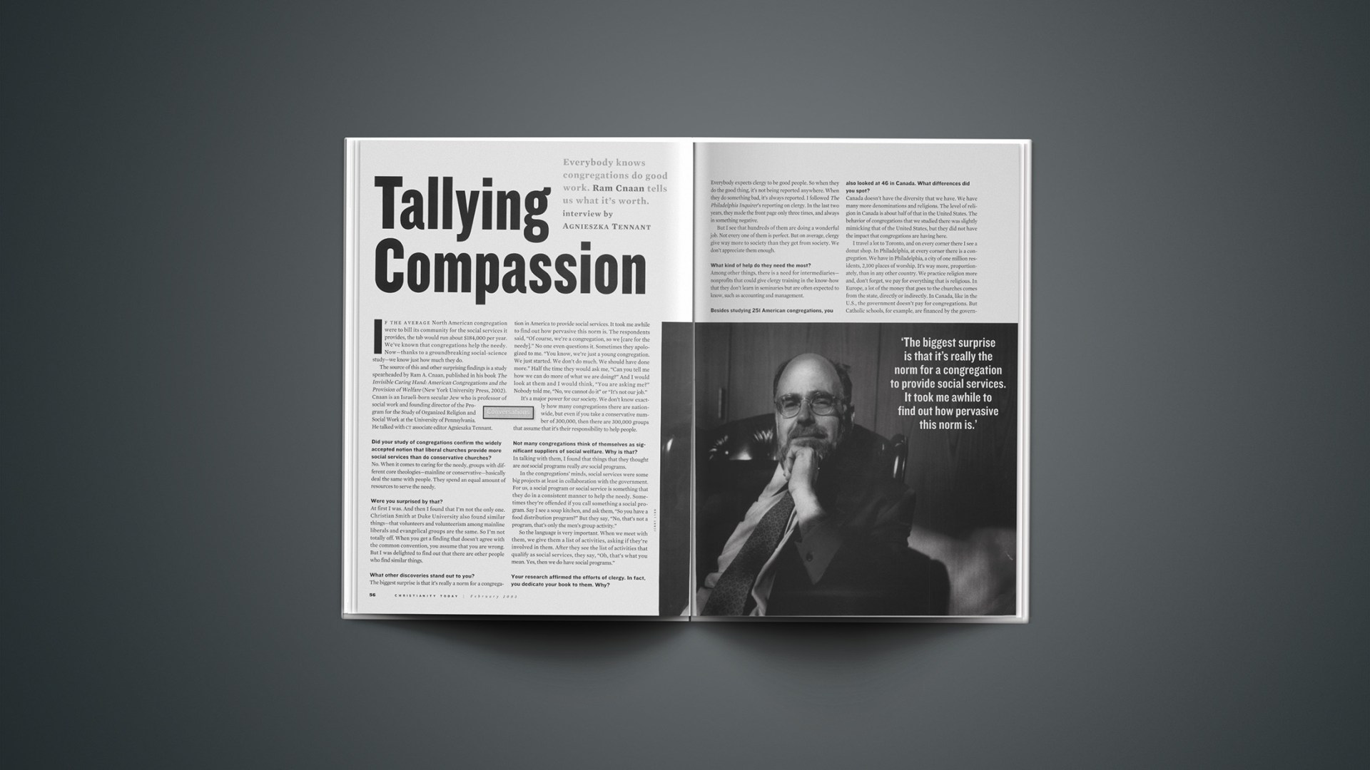 The source of this and other surprising findings is a study spearheaded by Ram A. Cnaan, published in his book The Invisible Caring Hand: American Congregations and the Provision of Welfare (New York University Press, 2002). Cnaan is an Israeli-born secular Jew who is professor of social work and founding director of the Program for the Study of Organized Religion and Social Work at the University of Pennsylvania. He talked with ct associate editor Agnieszka Tennant.