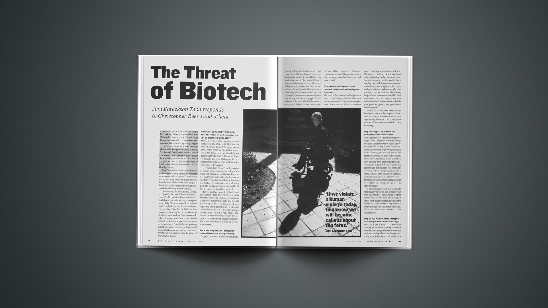 I have served on the National Council on Disability for two different administrations. I’ve led a national consortium of 80 disability organizations in my role as president of the Christian Council on Persons with Disabilities. I’ve interacted with thousands of disabled individuals who strongly believe that life is sacred even in this brave new world of biotech research, where humans and their genes may be cloned, copied, and altered. In the course of my ministry, I’m asked many probing questions about cloning and stem-cell research. Here are some of my responses, which contrast strongly with the views of Christopher Reeve.