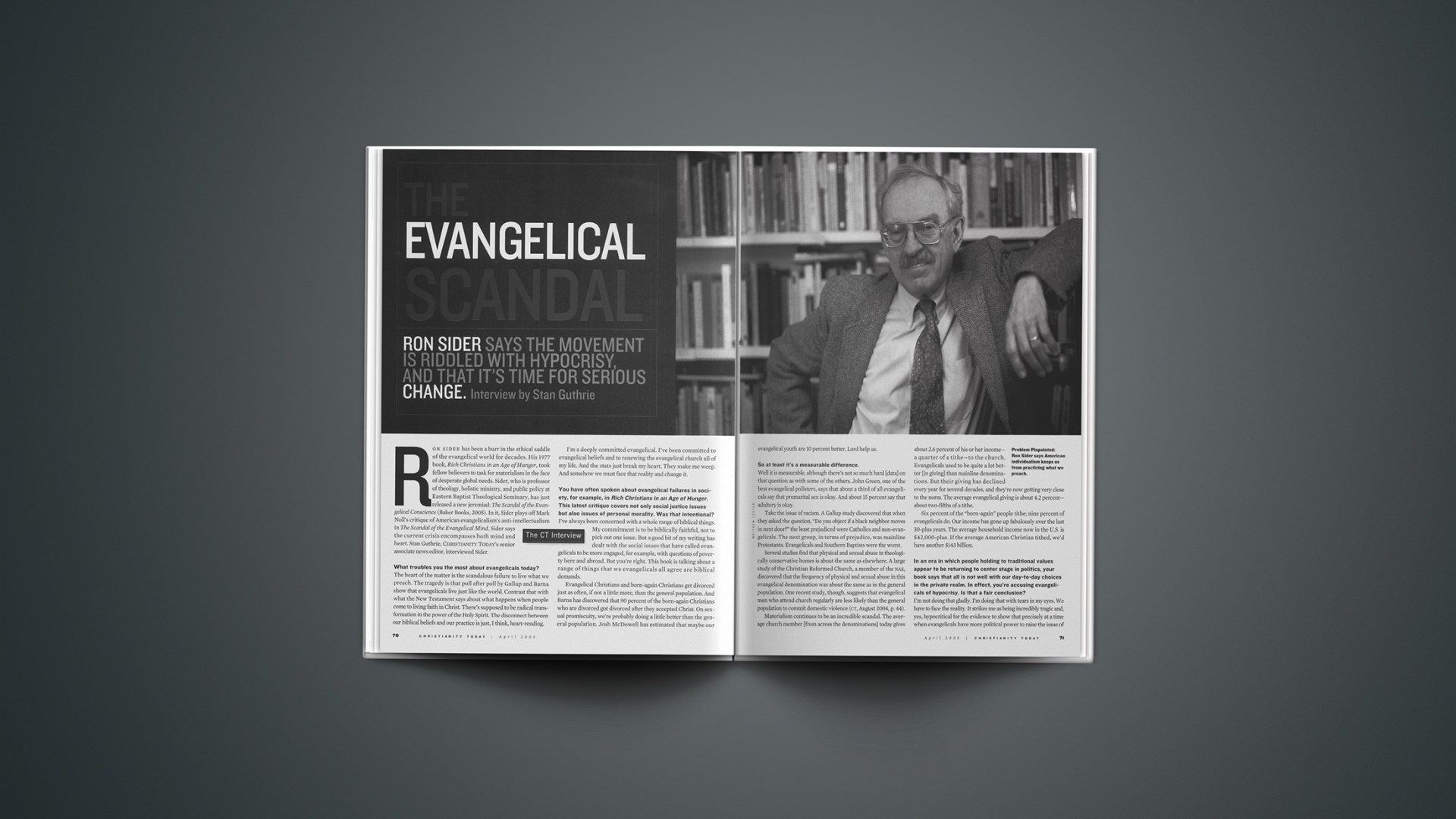 Ron Sider has been a burr in the ethical saddle of the evangelical world for decades. His 1977 book, Rich Christians in an Age of Hunger, took fellow believers to task for materialism in the face of desperate global needs. Sider, who is professor of theology, holistic ministry, and public policy at Eastern Baptist Theological Seminary, has just released a new jeremiad: The Scandal of the Evangelical Conscience (Baker Books, 2005). In it, Sider plays off Mark Noll’s critique of American evangelicalism’s anti-intellectualism in The Scandal of the Evangelical Mind. Sider says the current crisis encompasses both mind and heart. Stan Guthrie, Christianity Today‘s senior associate news editor, interviewed Sider.