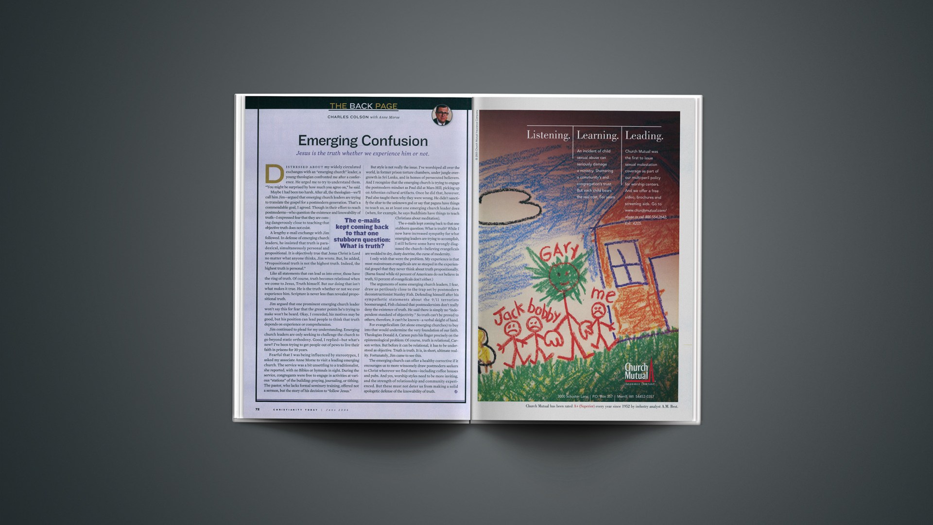 Maybe I had been too harsh. After all, the theologian—we’ll call him Jim—argued that emerging church leaders are trying to translate the gospel for a postmodern generation. That’s a commendable goal, I agreed. Though in their effort to reach postmoderns—who question the existence and knowability of truth—I expressed fear that they are coming dangerously close to teaching that objective truth does not exist.