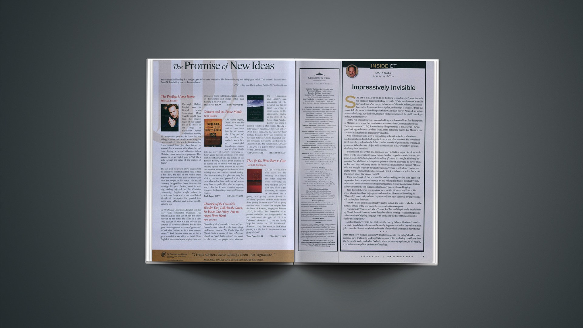 At the risk of insulting our esteemed colleague, this seems like a fair description of Madison, who wrote this issue’s cover story on Salem Communications (see “Making Airwaves,” p. 26). I wouldn’t say his appearance is nondescript—he’s as good looking as the next CT editor (okay, that’s not saying much). But Madison has a way of making himself impressively invisible.