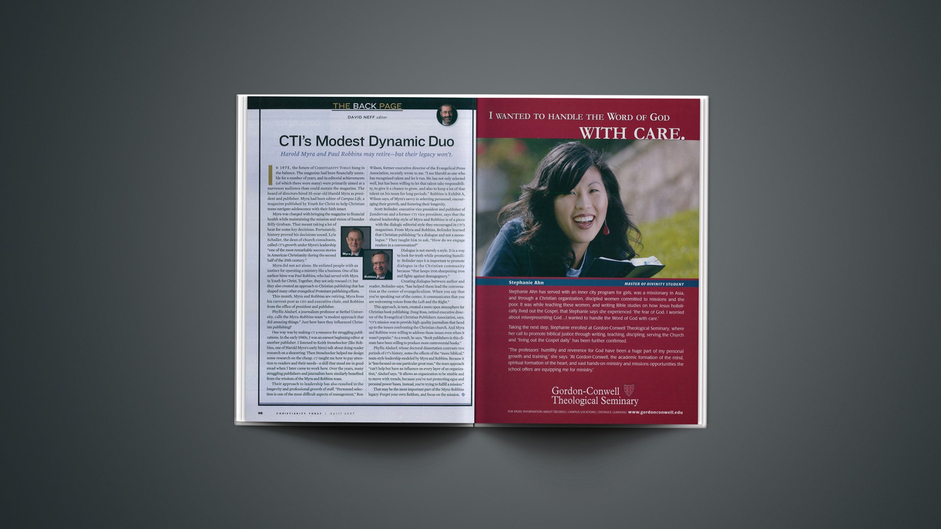 This approach, in turn, created a more open atmosphere for Christian book publishing. Doug Ross, retired executive director of the Evangelical Christian Publishers Association, says, “CT’s mission was to provide high-quality journalism that faced up to the issues confronting the Christian church. And Myra and Robbins were willing to address those issues even when it wasn’t popular.” As a result, he says, “Book publishers in this climate have been willing to produce more controversial books.”