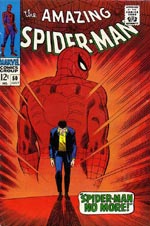 On one memorable occasion, it got so bad that Peter quit his double life. What fan can forget that full-page illustration, in Amazing Spider-Man No. 50 (July, 1967) of Parker trudging out a dark alley in the rain? Behind him lies his costume in a garbage can. (The scene was portrayed to good effect in Spider-Man 2.)