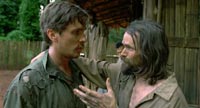 One especially unsettling scene occurs when a starving Dengler grabs a live snake from a murky river and then proceeds to bite into its scaly flesh while it is still wriggling around in his hands. This image—of a stoically animalistic Dengler exerting his dominion over a fellow creature in the wild—typifies the Edenic horror and beauty of Herzog’s vision of man and nature: equals in a precarious relationship subject to becoming predator-prey at any moment. The film reminded me at times of The Thin Red Line (with the ubiquitous imagery of a fallen Eden yearning for wholeness) and Apocalypto (with man struggling against both fellow man and nature’s brutal indifference).