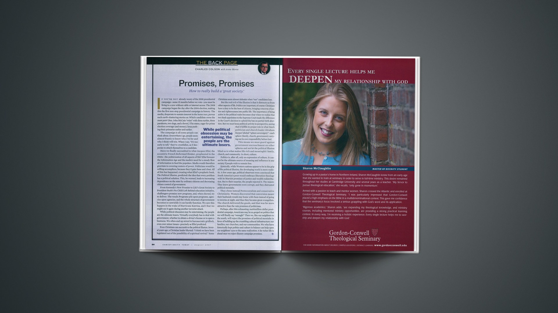 But the real evil of the illusion is that it distracts us from other aspects of life. Politics are important, of course: Christians have a duty to be the best of citizens, bringing concerns of justice and righteousness into public life. The importance of being active in the political realm becomes clear when we realize that two Bush appointees to the Supreme Court made the difference in the Court’s decision to uphold the ban on partial-birth abortion. But we must keep political activity in perspective, seeing that it fulfills its proper role in what Dutch politician and church leader Abraham Kuyper labeled “sphere sovereignty”—each sphere (family, church, government) carrying out its own responsibility before God.