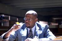 As each character is introduced, the emotion he or she represents appears onscreen, though what we’re looking at may seem contradictory. For example, the film begins with a shot of Forest Whitaker slumped against a wall, sobbing, holding a gun; then the word “Happiness” flashes onscreen. He tells us in voiceover that in childhood he knew “the secret to a happy life:” obey the rules and work hard. “And if you work hard in school, your reward is—more school.” At this point there’s a nifty sequence: the camera glides continuously to the right and reveals him, first, as a child writing at his desk in an elementary-school classroom, then as an adolescent in a middle-school classroom, and then as a young adult in a college classroom. “And after more school,” his voice goes on, “you are given the best that life has to offer”—the camera comes to rest to reveal him seated in the middle of a huge desk-farm of an office. He’s not happy.