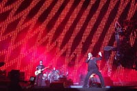 The experience of sight and sound that one encounters in U23D is undeniably breathtaking. When the film—directed by longtime U2 visual effects collaborator Catherine Owens—begins with the bang that is “Vertigo,” it takes a few minutes to adjust to the 3D gimmick (and make no mistake, it is a bit of a gimmick). But by the second song (“New Year’s Day”) the film’s rapturous energy and high-impact sensory-overload has you in its grip. High-definition 3D cameras soar above the stadium crowds, swooping and weaving in and around the band and the screaming throngs with cell phone “lighters” in the air. It’s a strikingly immersive experience, and were it not for the conspicuous lacking of concert smells (sweat, beer, controlled substances) and touch sensations (sweat, wind, rambunctious bodies), you might think you were there.