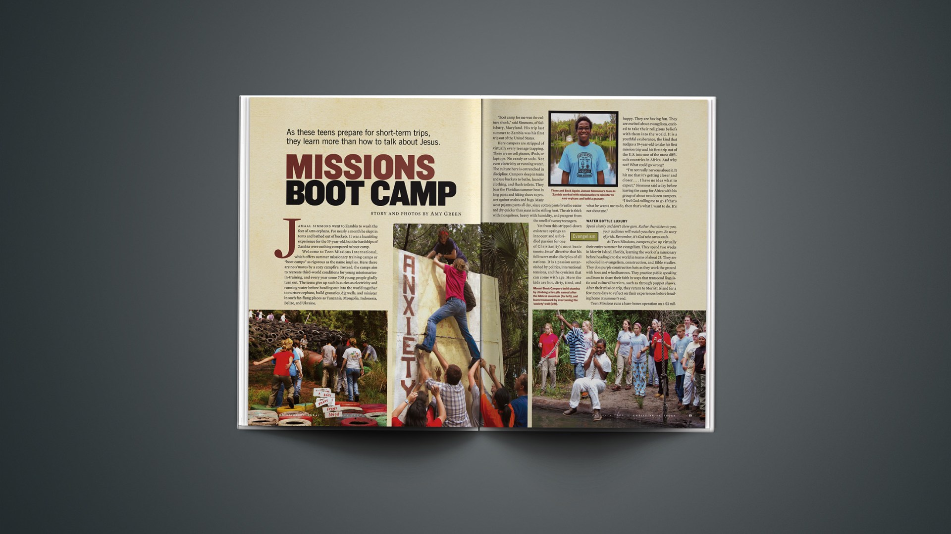 On an average day at a Teen Missions camp, attendees rise before dawn. For Simmons’s team, the day begins with what’s either lovingly or loathingly nicknamed “the OC,” an obstacle course meant to build teamwork and mental and physical stamina. At running speed, the campers complete obstacles inspired by biblical stories. There is Mount Sinai, a pile of tires, and Jacob’s Ladder, a rope ladder. They swing over a retention pond, wiggle through small plastic tubes, and climb wooden walls painted with words like “anxiety.” Standing at least 10 feet high, the walls require an entire team working together to overcome.