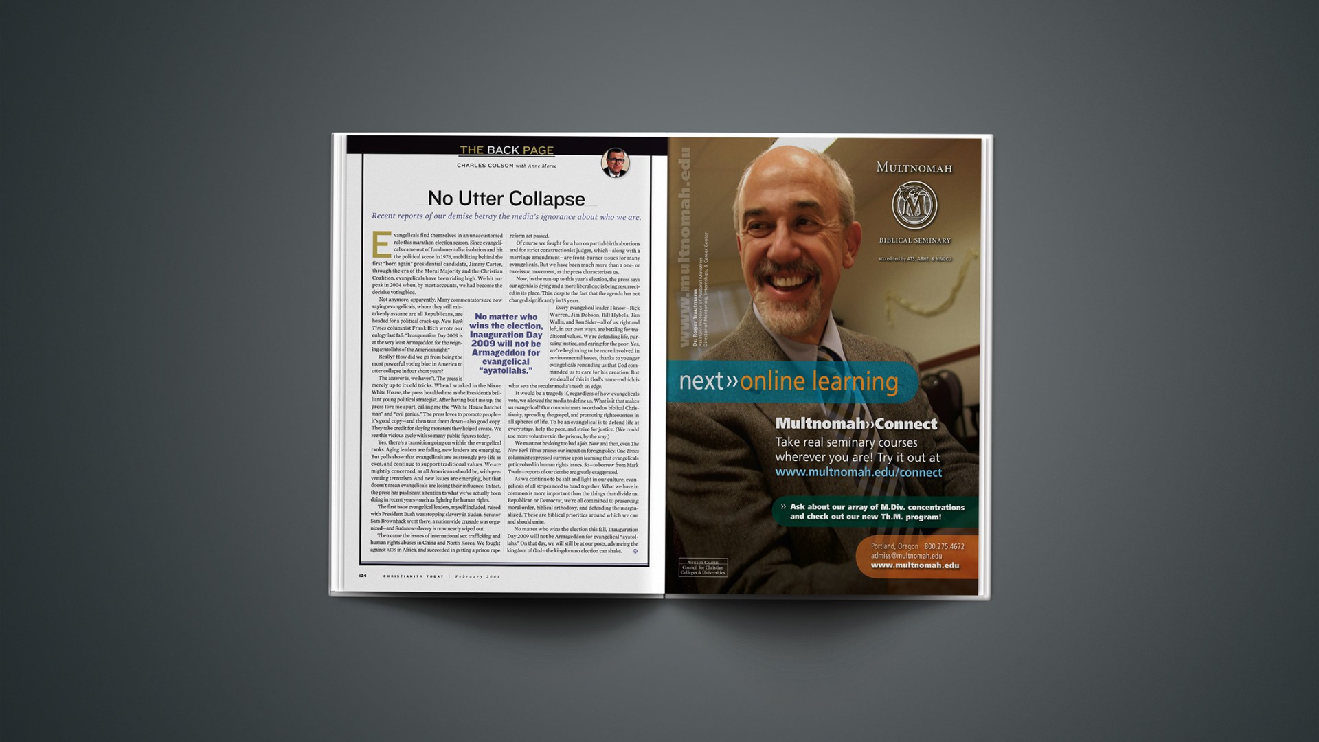 Not anymore, apparently. Many commentators are now saying evangelicals, whom they still mistakenly assume are all Republicans, are headed for a political crack-up. New York Times columnist Frank Rich wrote our eulogy last fall: “Inauguration Day 2009 is at the very least Armageddon for the reigning ayatollahs of the American right.”