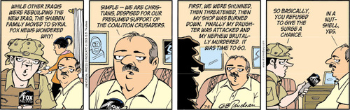 The background–not in the comic strips, although alluded to–is that Iraq’s Christians, the largest non-Muslim religious group in Iraq , are represented disproportionately in the refugee population (although it should be mentioned that the Assyrian diaspora dates back to World War I). It’s such a huge drain that some churches in Iraq have no members left. Christians can be identified by their names and ID cards, and they are often targeted for violence. The Assyrian International News Agency (AINA) is calling it genocide. So, many Assyrians leave as soon as they can. Others, like the family in Doonesbury, wait until something unbearable happens.