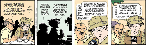 Gary B. Trudeau’s Doonesbury, which newspapers publish either with the comics or the editorial cartoons, just wrapped up a series about Iraqi Christian refugees. Roland (in this series a Fox News correspondent) is trying to cover the story of an Assyrian family in a way that is flattering for the Surge. Doonesbury treats the imaginary Iraqis with a great deal of dignity. Fox News doesn’t fare so well.