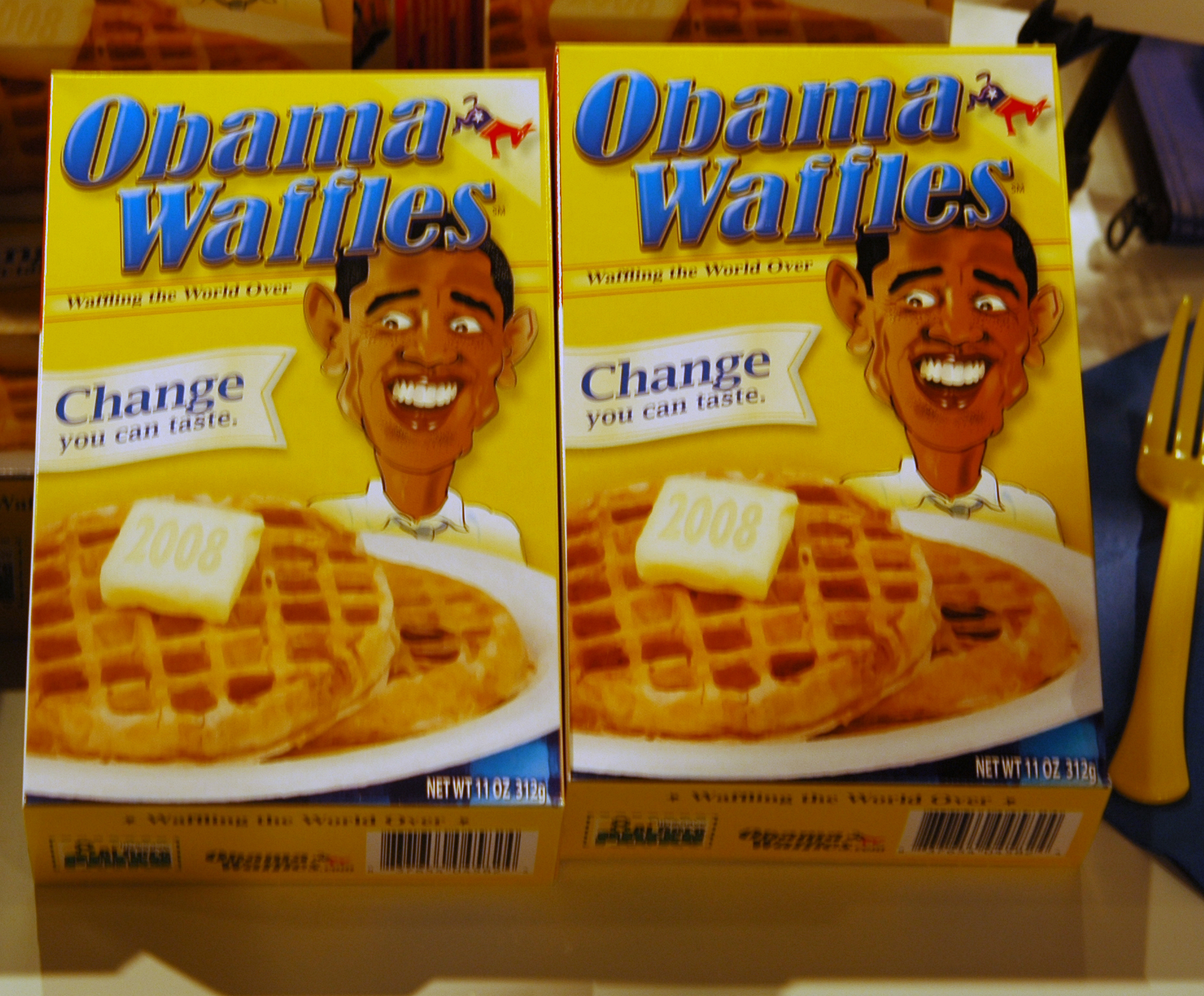 The back of the box includes a drawing of John Kerry saying “I know a thing or two about wafflin’ and I approve this mix” and Michelle Obama saying “For the first time in my adult life I’m proud of an American waffle.”