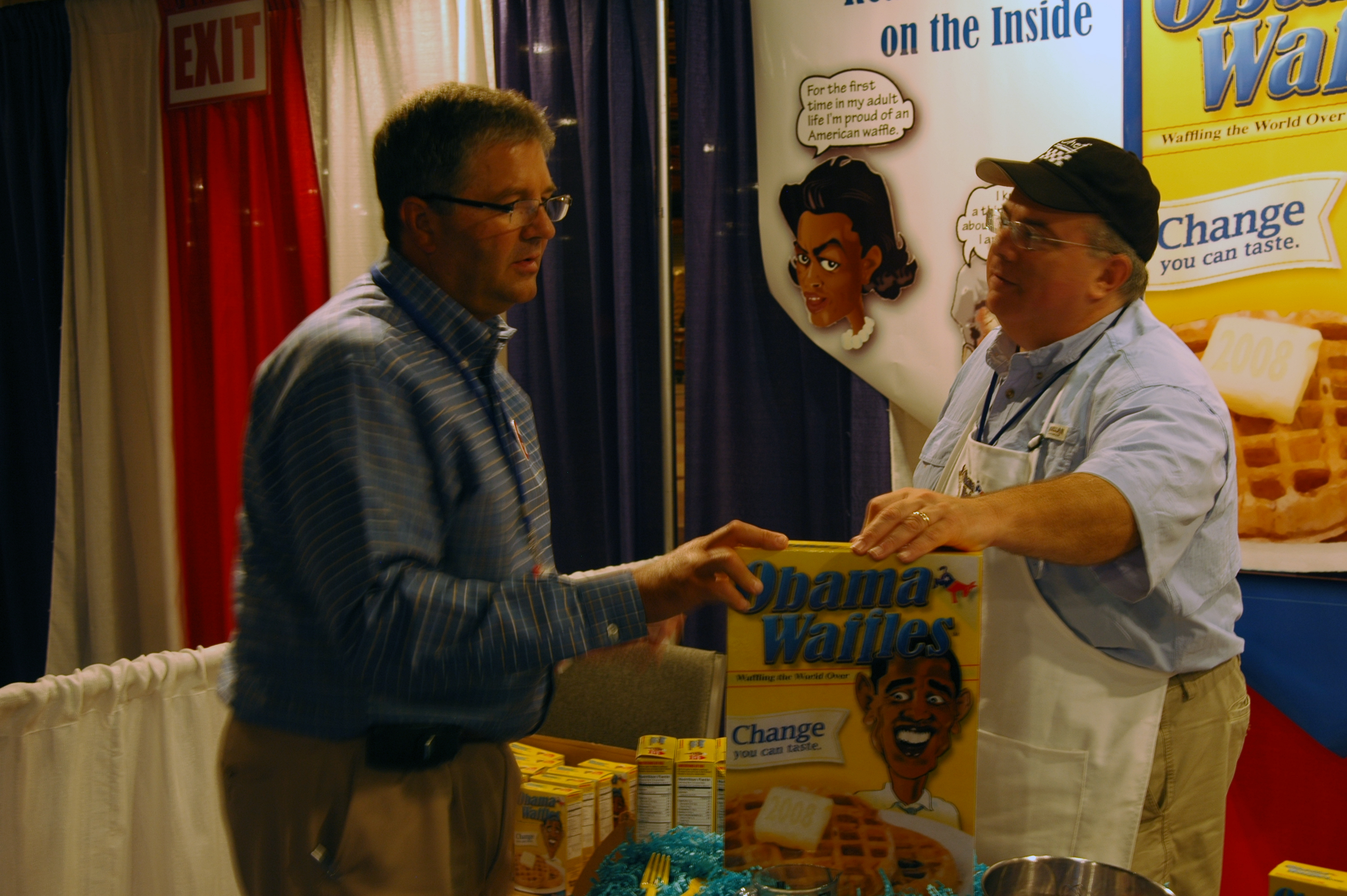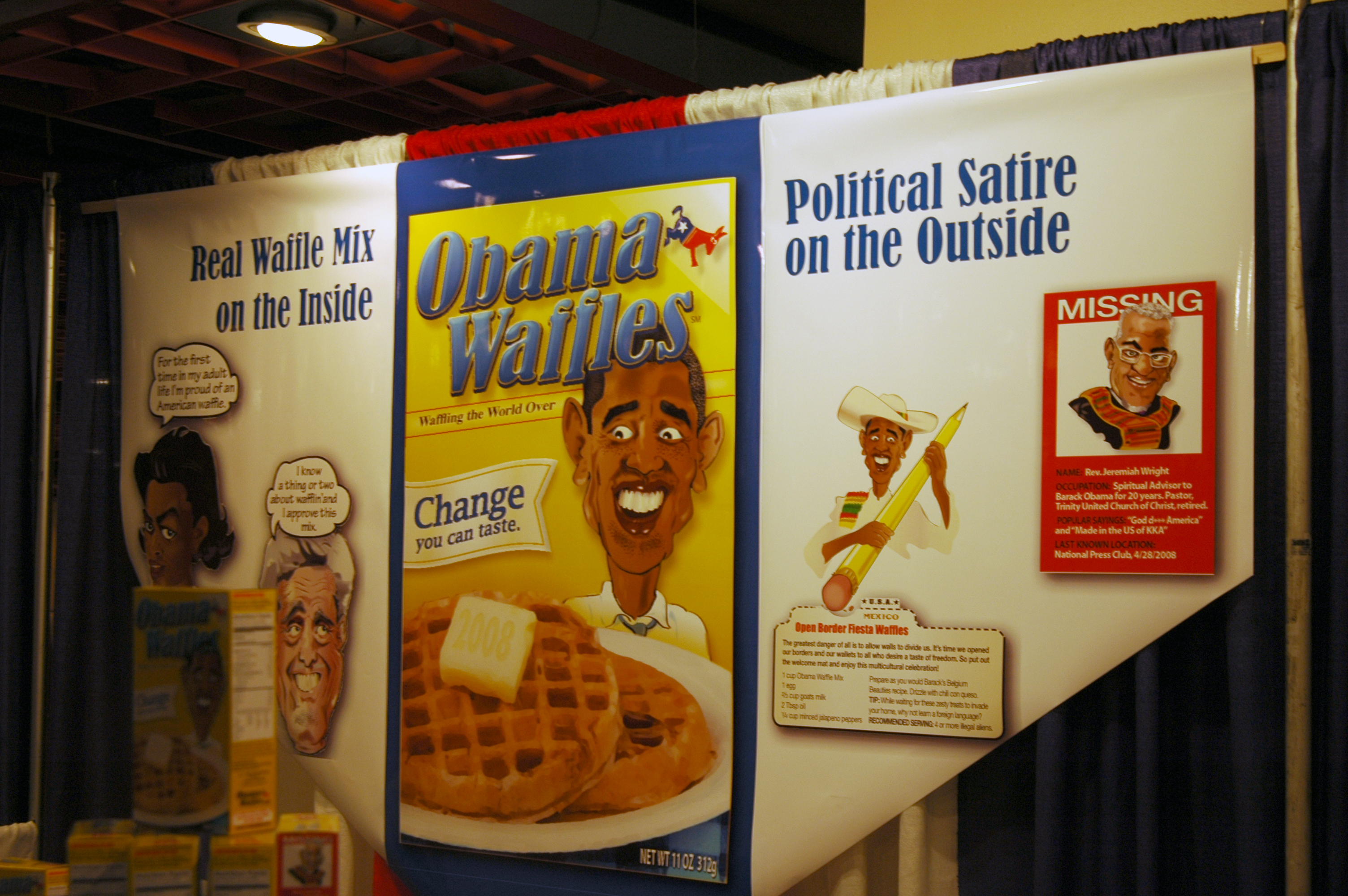 Men from Tennessee traveled to the Values Voter Summit to sell yellow boxes of waffle mix that portray a caricature of Democratic presidential candidate Barack Obama with a Muslim-like headdress and says “Point box toward Mecca for tastier waffles.” The cover of the box portrays a caricature of Obama’s face next to waffles, which three protesters from American Atheists found offensive.