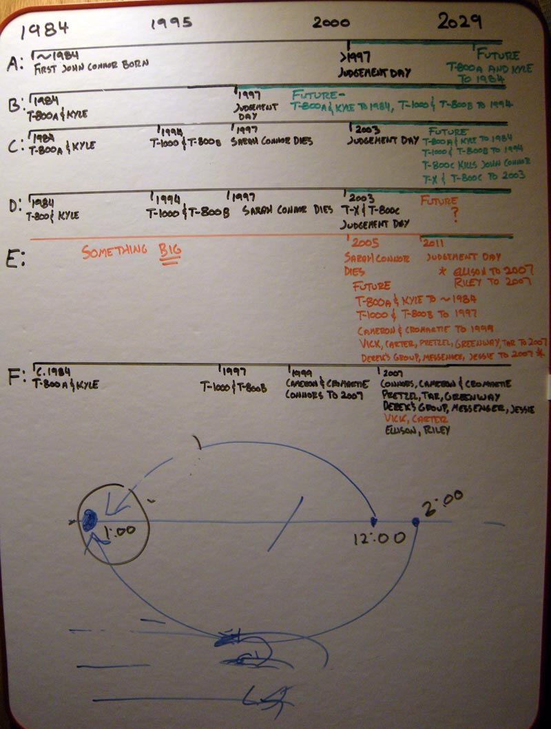 Meanwhile, in other news, io9 (via Carmen Andres) has posted a chart that attempts to show the entire history of the Terminator franchise, including all the timelines that have been revealed in the movies and TV episodes to date. It looks fun, but if I were to take it at all seriously, I think the chart makes three errors: