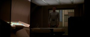 This is the final shot of a sequence that began with Kirk and Captain Decker butting heads over who would be the best person to lead the Enterprise on its current mission. Once the head-butting is over, Kirk dismisses Decker, only to be lectured privately by Dr. McCoy, who had tagged along to witness the tête-à -tête between the two captains. And when McCoy finally leaves the room, Kirk stands motionless behind his desk as the glass doors close, symbolizing both the loneliness that comes with being in a position of authority as well as the estrangement that comes between Kirk and his colleagues when their hearts and minds are not properly aligned with one another.