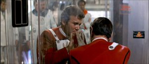 But watching the two films back-to-back last night, I was struck by one other thing they have in common: namely, their use of glass doors to symbolize the loneliness of Kirk. You can see it, for example, in the shot above, from The Motion Picture.