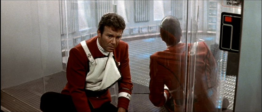This sequence is shot from a number of angles, but I like the two to the right in particular. The first image once again places Kirk behind the glass, and it emphasizes the separation between Kirk and Spock as one of them tries to touch the other’s hand. (There is a lot that could be said about this, given how important hands are to Vulcan interaction, but I’ll skip all that for now.) But you can still see McCoy, Scotty and at least one other crew member in the background – so I really like the second shot, and the way it emphasizes Kirk’s utter isolation. Yes, Spock is there, but he is dead, and facing away from Kirk, and trapped behind the glass. If there is anyone else in Kirk’s life that he could turn to – a support network, if you like – they are all kept well, well out of the frame.