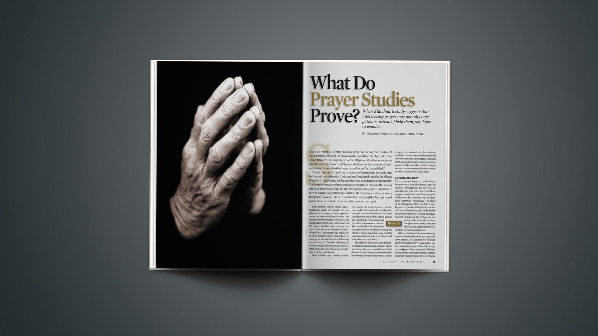 Studies on prayer in medicine have a way of demarcating the battle lines between saints and skeptics: Christians long for scientific proof of the efficacy of prayer. Critics, waiting for the opposite, hope to undermine religious faith. For better or worse, we have seen many attempts to measure the healing effects of intercessory prayer. The first known studies were published in 1873 by English polymath Francis Galton. He found no statistical evidence that prayer prolonged life or reduced stillbirths (though his findings would not meet today's criteria for a controlled prospective study).