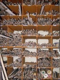 Sometimes, archival materials are not stored at the archivist's already obscure office, but someplace even more obscure off-campus. Also, archived materials are not usually indexed card-catalog style, much less electronically searchable. Instead, they are organized into folders, stored in flat, rectangular boxes, designed, frankly, more to protect the materials than to make them accessible. If you're lucky, someone on the library staff has prepared a guide to the collection, giving maybe a few sentences on the contents of each box. If you're not so lucky, you need to be really nice to the archivist, because he or she will probably need to fetch lots of boxes out of storage that you might not need at all.