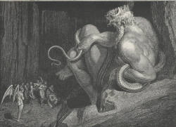 The monster Minos was a mythical king of Crete who after death was said to become a judge of the dead in Hades. That much Dante borrowed. But the act of coiling his tail around himself the precise number of times needed to indicate the circle of hell to which the sinner is to be “whirled below” is Dante’s imaginative invention.