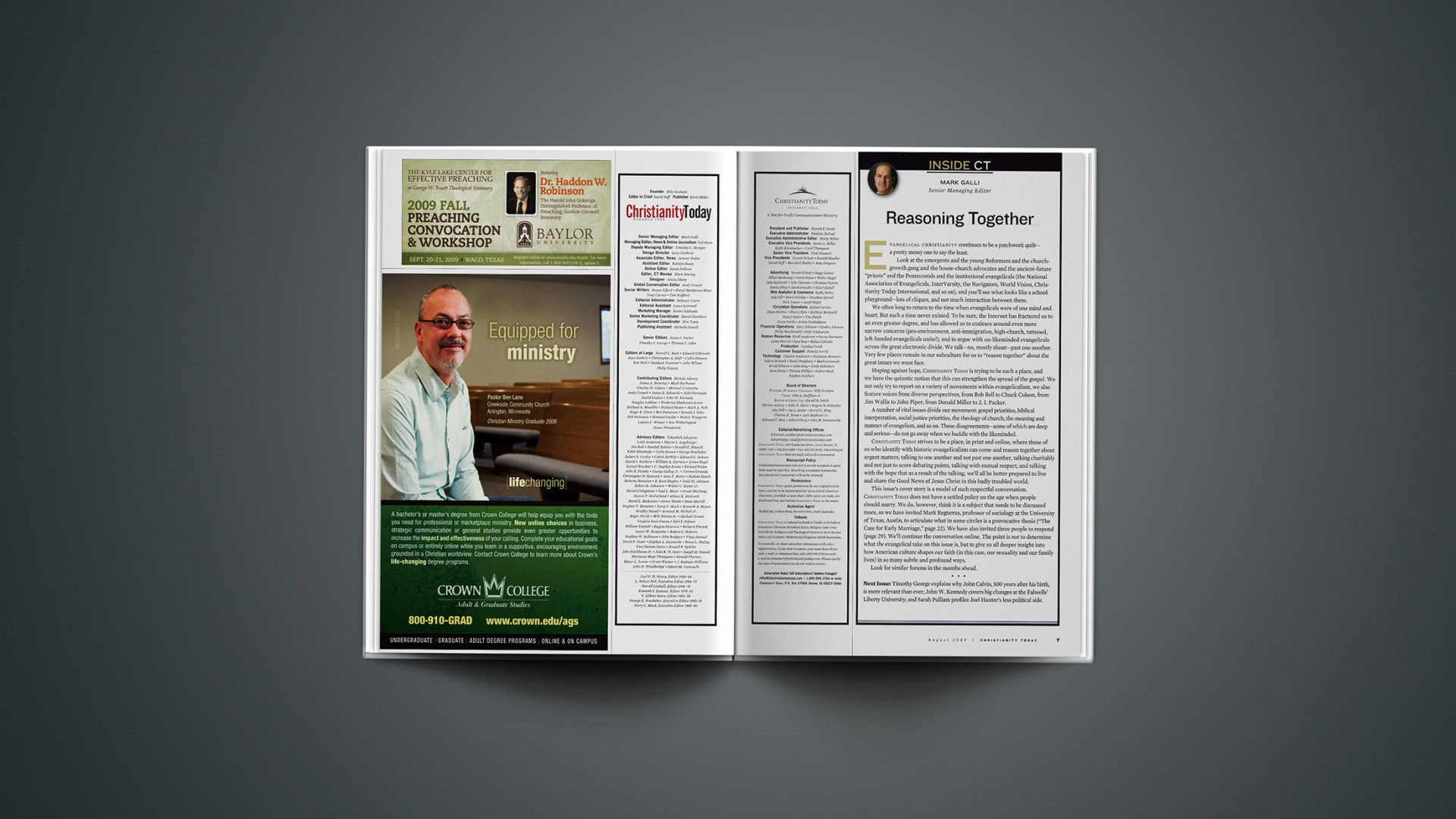 Christianity Today strives to be a place, in print and online, where those of us who identify with historic evangelicalism can come and reason together about urgent matters, talking to one another and not past one another, talking charitably and not just to score debating points, talking with mutual respect, and talking with the hope that as a result of the talking, we’ll all be better prepared to live and share the Good News of Jesus Christ in this badly troubled world.