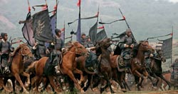 Rather than surprise us with exhilarating twists in the midst of battle, Woo grants his full access to the war cabinet. Like invisible generals, we stalk the room, peering at leather maps and figurines representing troop movements. We know exactly what will happen and when. Instead of undercutting the tension, this ploy actually heightens it. We feel as if we have as much invested in the outcome of the battle as the characters on screen. We know how the good guys plan on defeating the bad, but not if they will be successful. There are times when the plans work out so precisely (a scene in which the military strategist Zhuge Liang undertakes a mission to replenish the army’s impoverished cache of arrows being a perfect example) that the audience cannot help but whoop and holler in euphoric support.