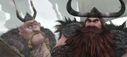 So how ironic is it that Dragon does better in the scenes of silence? You get the feeling that Dreamworks is slowly learning from Pixar how to show (the flying and the dragon bonding) instead of tell (the opening sequence). Toothless is remarkably animated, expressing so much in body language. Fierce in once scene, cute as a puppy the next—the difference is in the eyes, but pay attention to what causes Toothless to let his guard down and befriend the humans.