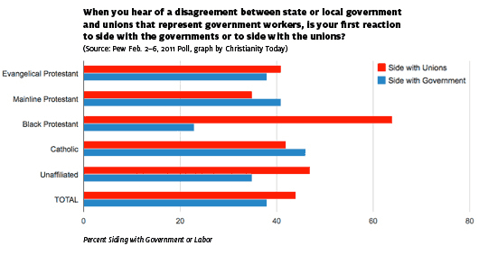 Both sides in the public labor stand-off in Wisconsin often wrap their arguments in moral and religious rhetoric. Most Americans, however, may want to avoid bringing up the issue at church. A February poll by Pew Research Center for People and the Press finds that evangelicals are split over fights between state and local governments and public labor unions.