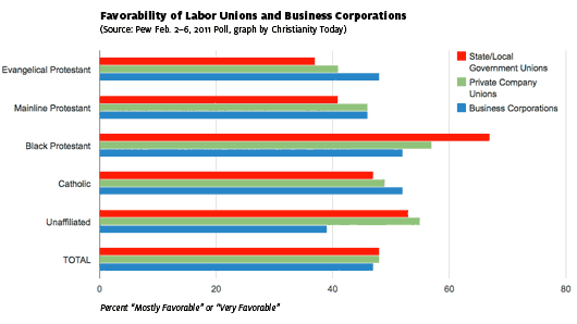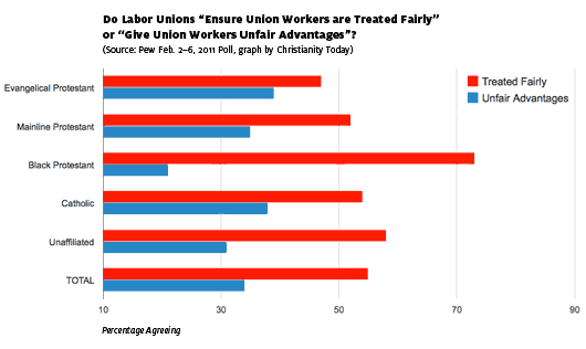 A Pew Research Center survey suggests evangelicals have the lowest favorability toward government employee unions of any religious group.