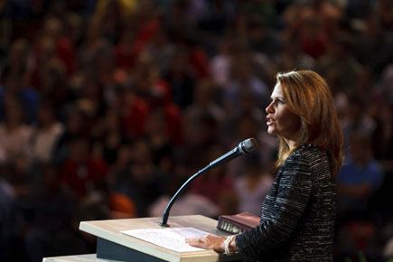 Bachmann was introduced by Chancellor Jerry Falwell, Jr., as a “constitutional conservative” committed to “bold reforms” in fighting the “evils of big government,” as well as a “defender of the unborn” and a “deeply committed Christian.” Falwell also noted her role as the first woman elected to Congress in Minnesota.