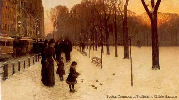 There is a wonderful painting by the 19th-century American artist Childe Hassam titled “Boston Common at Twilight” (above)—a wintry scene that is nevertheless warm and inviting, with golden backlighting and gaslights twinkling-on at the end of the day; its street cars and formally attired people feeding the hungry wintering birds.