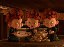 Compounding the issue is some surprisingly thin character development. Pixar films are typically populated (right down to the bit parts) with people, creatures and animate objects who leave indelible impressions—think of Toy Story‘s Slinky Dog and Etch-a-Sketch, Finding Nemo‘s aquarium dwellers, or Monsters Inc‘s George Sanderson (the hapless monster who keeps getting decontaminated by the CDA.) Brave‘s supporting cast is decidedly more forgettable. The film’s hordes of Scottish clansmen have a few fun features (one lord in particular is sure to please Braveheart fans), but for the most part they are barely distinguishable from each other. Merida’s three would-be suitors are disappointingly flat caricatures. And though the rambunctious behavior of her triplicate younger brothers puts some icing on the cake, the film is lacking the layers needed to make the humor truly delicious. As a result, Brave‘s screenplay writers are forced to resort to cheaper comedy than we’re used to finding in a Pixar flick.