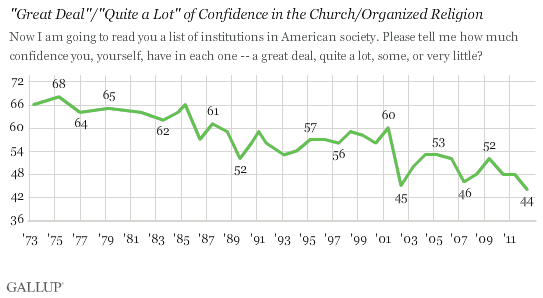 A fresh update to Gallup’s annual “Confidence in Institutions” survey reveals that only 44 percent of Americans today have “a great deal or quite a lot of confidence in ‘the church or organized religion.'” Americans ranked organized religion at the top of their confidence list almost every year from 1973 to 1985. Now it is tied with the medical system.