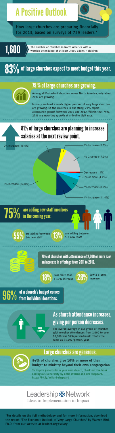 New research from Dallas-based Leadership Network (full infographic below) indicates that 75 percent of megachurches–those reporting attendance of 2,000 or more people on a weekly basis–intend to hire new staff members in 2013. The full report, “The Economic Outlook of Very Large Churches,” also reveals that 83 percent of megachurches plan to meet their 2013 financial budgets.