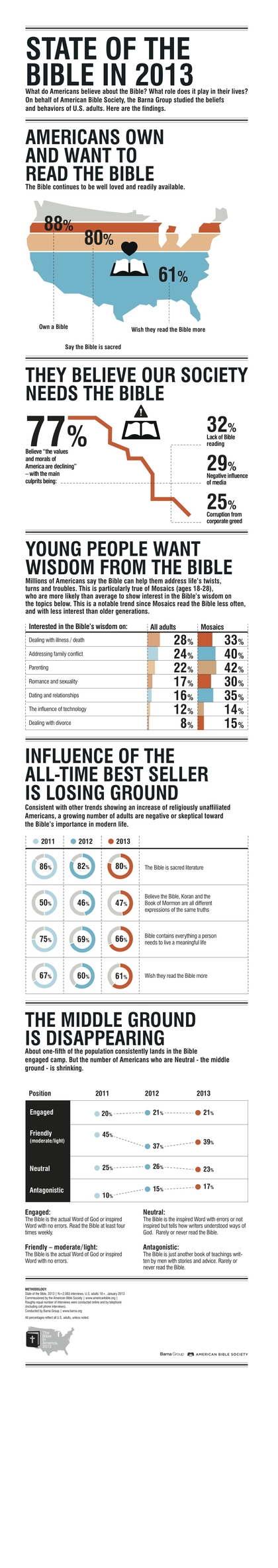 More than 3 in 4 Americans say the country is in a state of moral decline–and almost 1 in 3 attribute the cause to a “lack of Bible reading” (narrowly beating out “negative influence of media”).