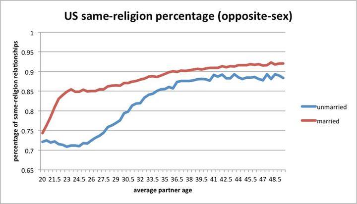 At age 25, 85 percent of marriages are between two people of the same religion, while only 72 percent of unmarried relationships are likewise.